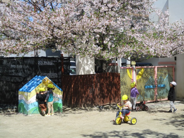 桜の花びらが舞い散る中、子ども達が元気いっぱい遊んでいます。