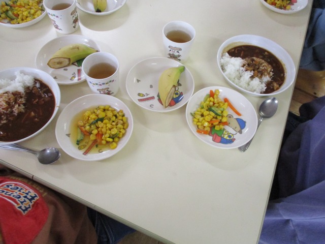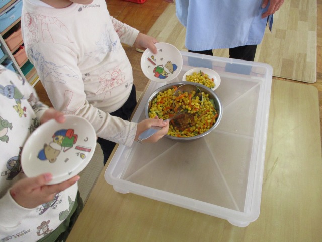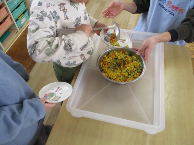 2月3日、年中児と年長児が給食のコーンサラダを自分で盛り付ける活動を行いました。