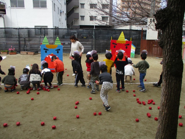 自分で作った鬼のお面をかぶり、鬼退治ゲームに参加した子ども達。
